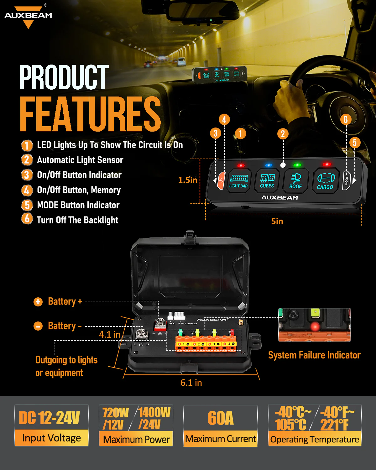 • 4/6-Gang one-sided outlet switch panel. It allows you to control up to 4/6 different LED lights or devices. Command all your vehicle accessories by the tap of your finger.