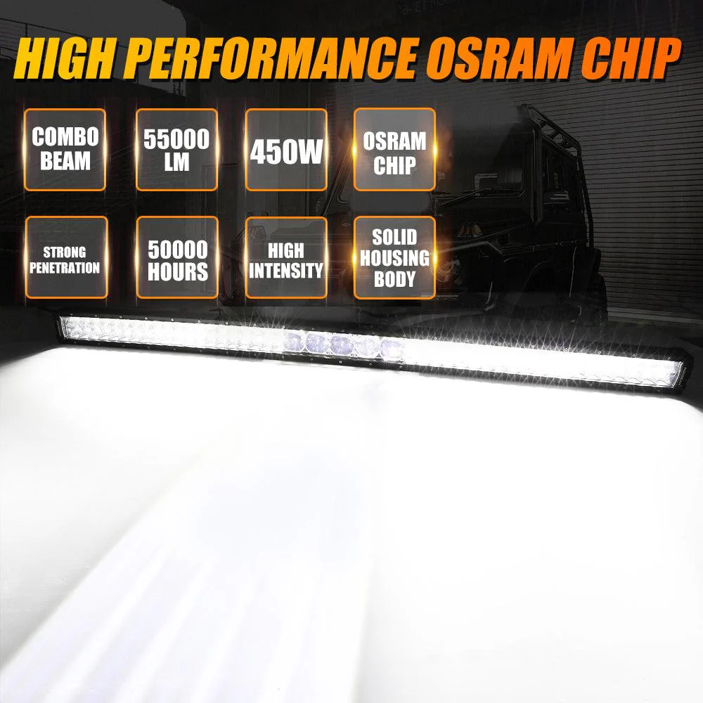 Specifications : Size: 52″ Wattage: 450W Input voltage: 10-30V Lumens: 55000LM Lighting Distance: 1LUX@1345M LED Type: KW3+P8 chips LED Chips Quantity: KW3*5+P8*80 Beam Type: Combo with 5D Projectors Color temperature: 6500K Waterproof rate: IP68 Light color: White Body color: BLACK PCS/SET: 1Pcs Features : Newest upgraded Design. High-intensity OSRAM P8+KW3 LED chips, central extra large projector, spot beam & flood reflector combo on both sides.…