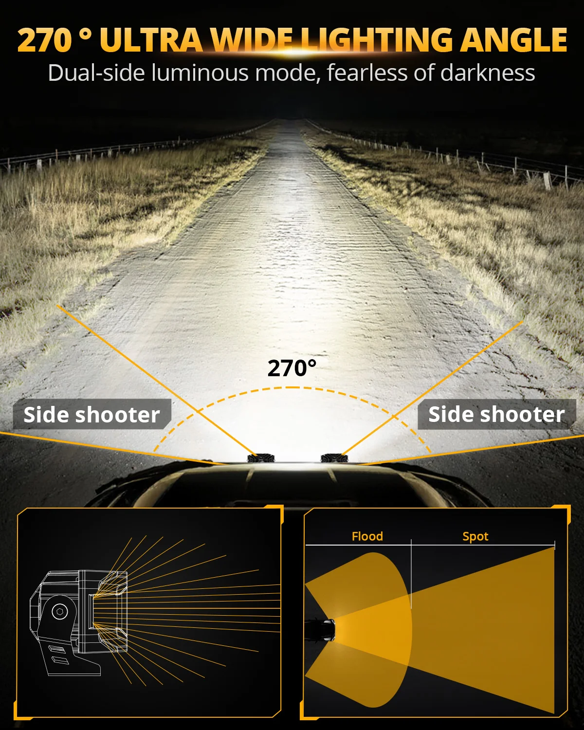 Side Shooter Design: Designed with dual side lights to work together with front spot light. Light coverage to clear darkness and potential hazard, increasing your driving safety.