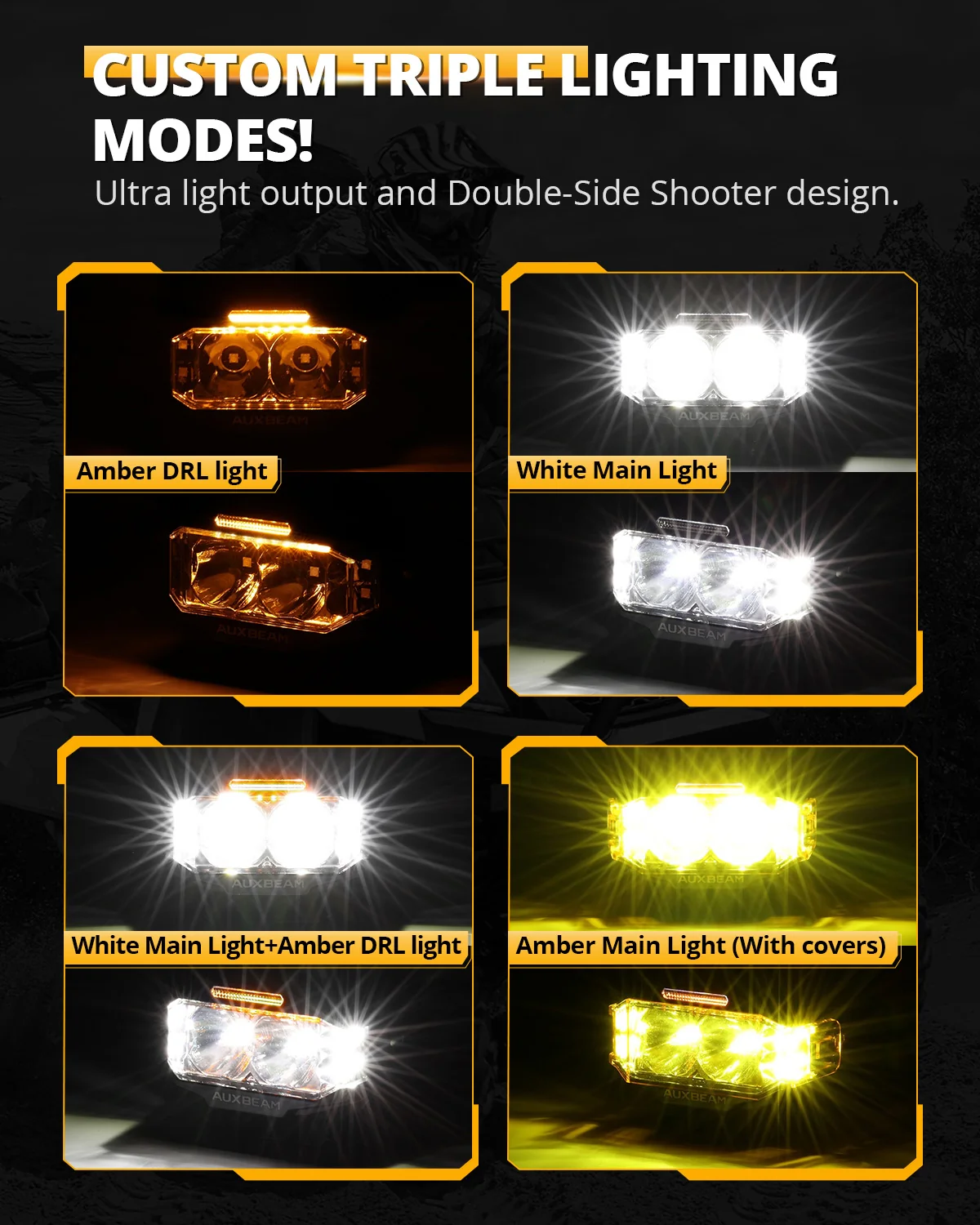 3 Light Modes: Side shooter light and front spot light together are main lighting mode to provide a clearer, wider and further visibility for your night time driving. While amber DRL is a daytime lighting mode to add extra safety by capturing other drivers’ notices of your presence on the road. Both modes can be used simultaneously.Combining three modes, it’s the perfect light to ensure your safety throughout the whole day.