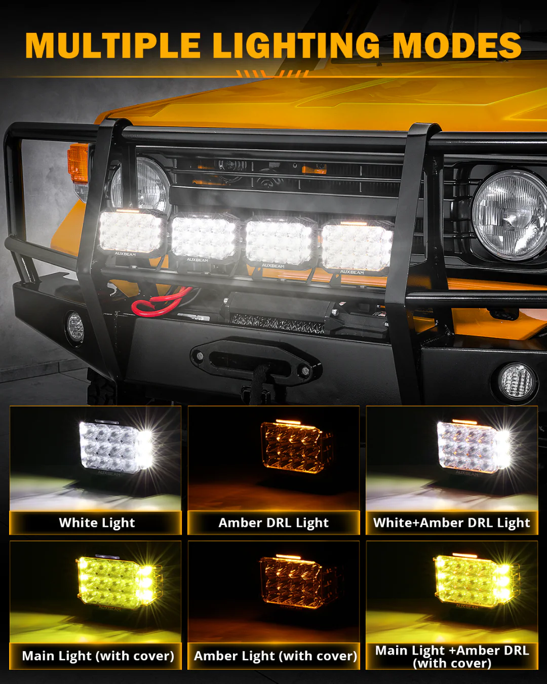 3 Light Modes: Side shooter light and front spot light together are main lighting mode to provide a clearer, wider and further visibility for your night time driving. While amber DRL is a daytime lighting mode to add extra safety by capturing other drivers’ notices of your presence on the road. Both modes can be used simultaneously.Combining three modes, it’s the perfect light to ensure your safety throughout the whole day.