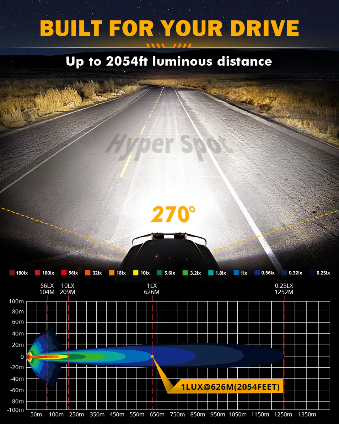 Side Shooter Design: Designed with dual side lights to work together with front spot light. Light coverage to clear darkness and potential hazard, increasing your driving safety.