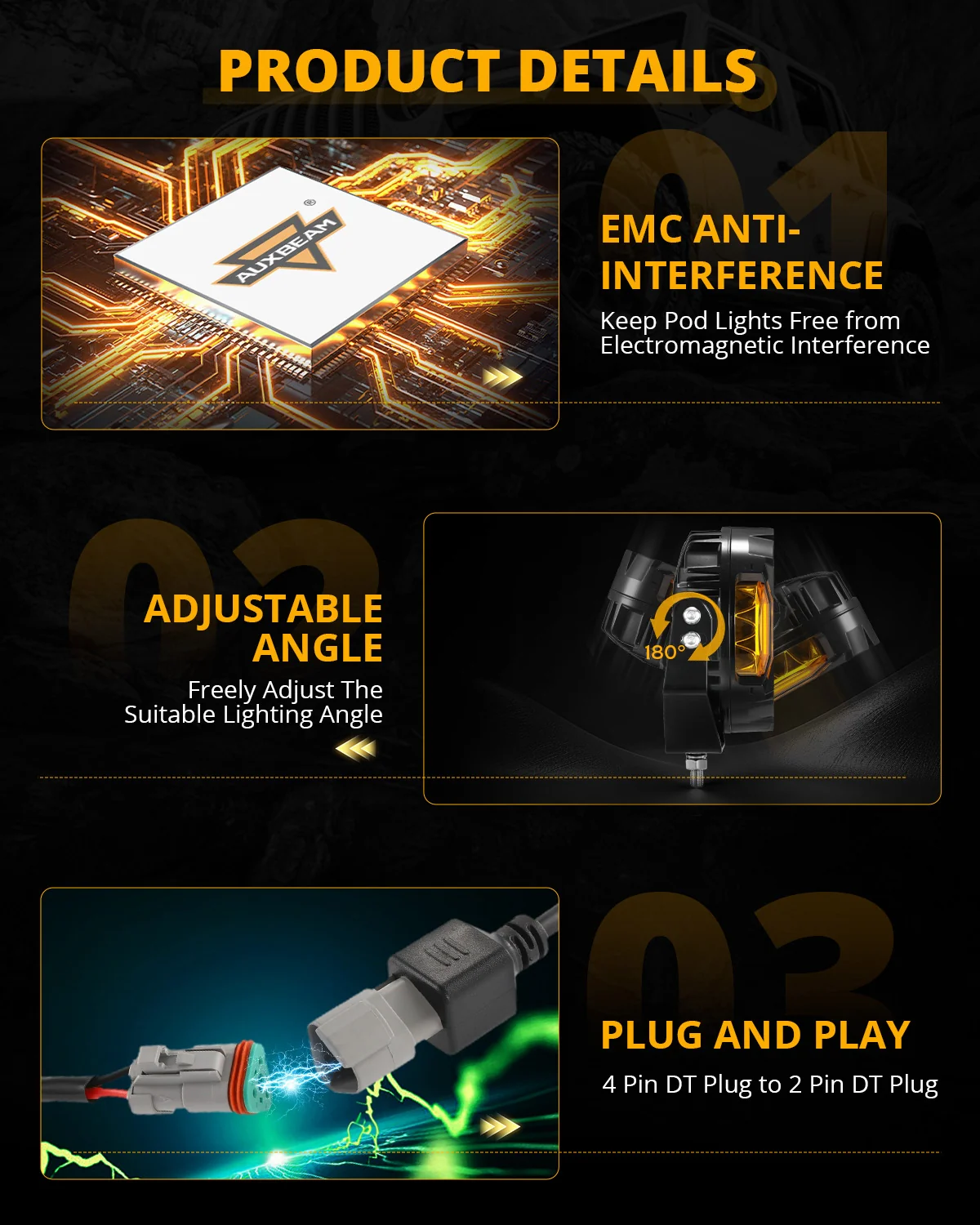 Amber DRL Light Feature: Our DRL design is truly one-of-a-kind. We’ve added an amber DRL light function that works in tandem with our ultra-bright white light. Not only alerts other drivers in foggy or rainy conditions, but also complements other weak headlights on your vehicle. This feature also adds a touch of fashion style and elevates its overall appearance.